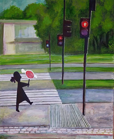 Ten obraz skłania do refleksji nad równowagą między wolnością a zasadami. Sylwetka dziewczynki z czerwonym znakiem stopu na tle sygnalizacji świetlnej symbolizuje wybór: podporządkować się ograniczeniom czy je odrzucić. Czerwony kolor w znakach może uosabiać społeczne granice, a postać dziecka – niewinność wobec nich. Być może artysta pyta: gdzie przebiega granica między bezpieczeństwem zasad a utratą wolności, czy jest miejsce na spontaniczność w świecie pełnym regulacji?