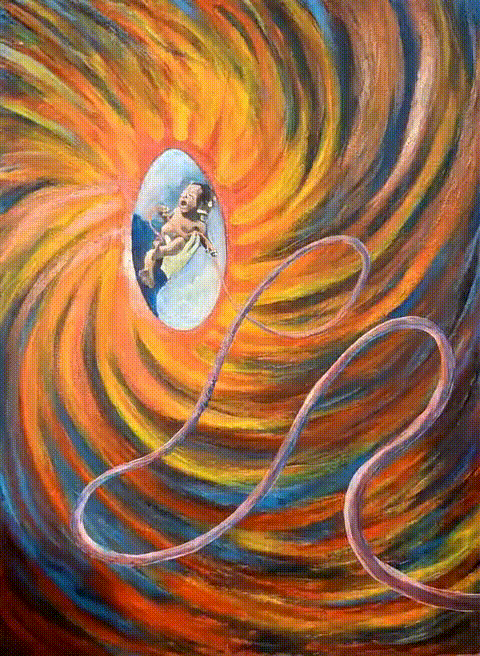 У маленькому отворі у формі цифри «0» або яйця з’являється новонароджене дитя, що тримається обома руками за пуповину — символ зв’язку з початком життя. Спіральний, райдужно-жовто-помаранчевий вихор оточує дитину, показуючи енергію перетворень і невпинного руху. Пуповина, що зростає на передньому плані, нагадує про міцний зв’язок між минулим і майбутнім. Образ говорить про цикл життя, нескінченність і надію, яку приносять народження.