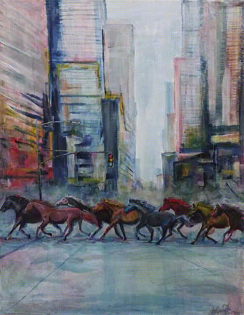 The artist likely intended to depict a contrast between nature and the urban environment, using the image of horses running among city skyscrapers. This scene may symbolize freedom, wildness, or the return of nature to the modern world, where it is often suppressed. The use of vibrant, abstract colors adds emotional depth and emphasizes the dynamism of the scene, possibly hinting at a struggle or harmony between these opposites.