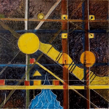 Ця картина — абстрактний твір, що поєднує яскраві кольори, такі як жовтий і синій, з темним фоном і геометричними лініями. Жовті елементи, позначені цифрами 1 і 2, символізують сонце та рух, а синій потік унизу — воду та енергію. Композиція відображає гармонію природи з людськими конструкціями, запрошуючи до роздумів про зв’язок між ними.